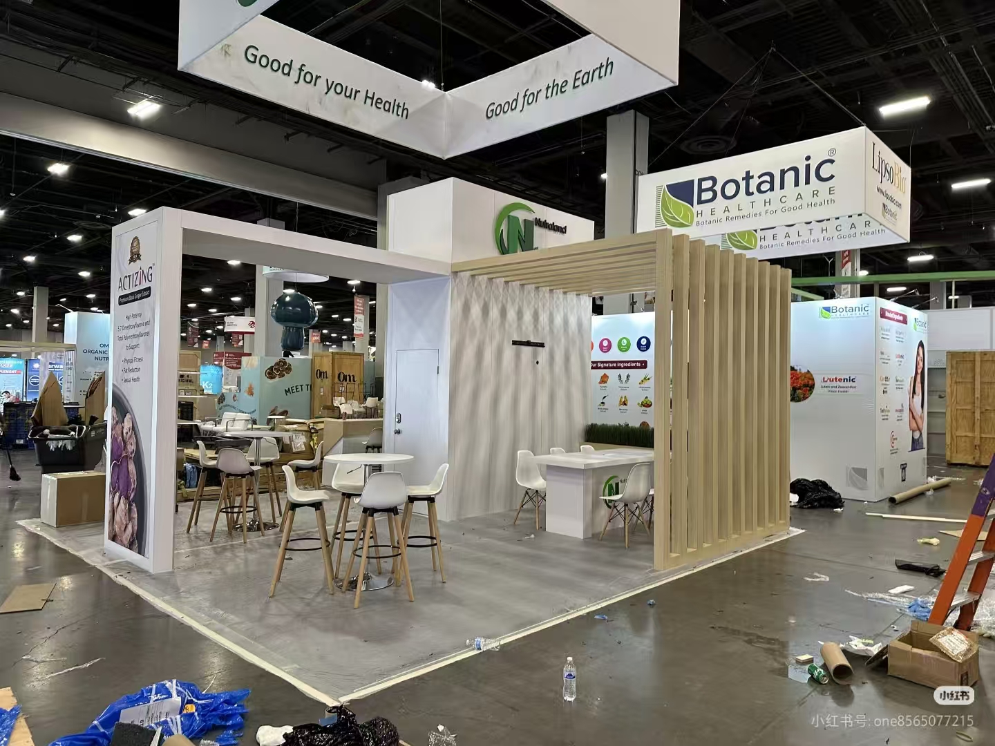 Functional Layout: The booth integrates a reception area, product display, and seating zone, balancing functionality with aesthetics.