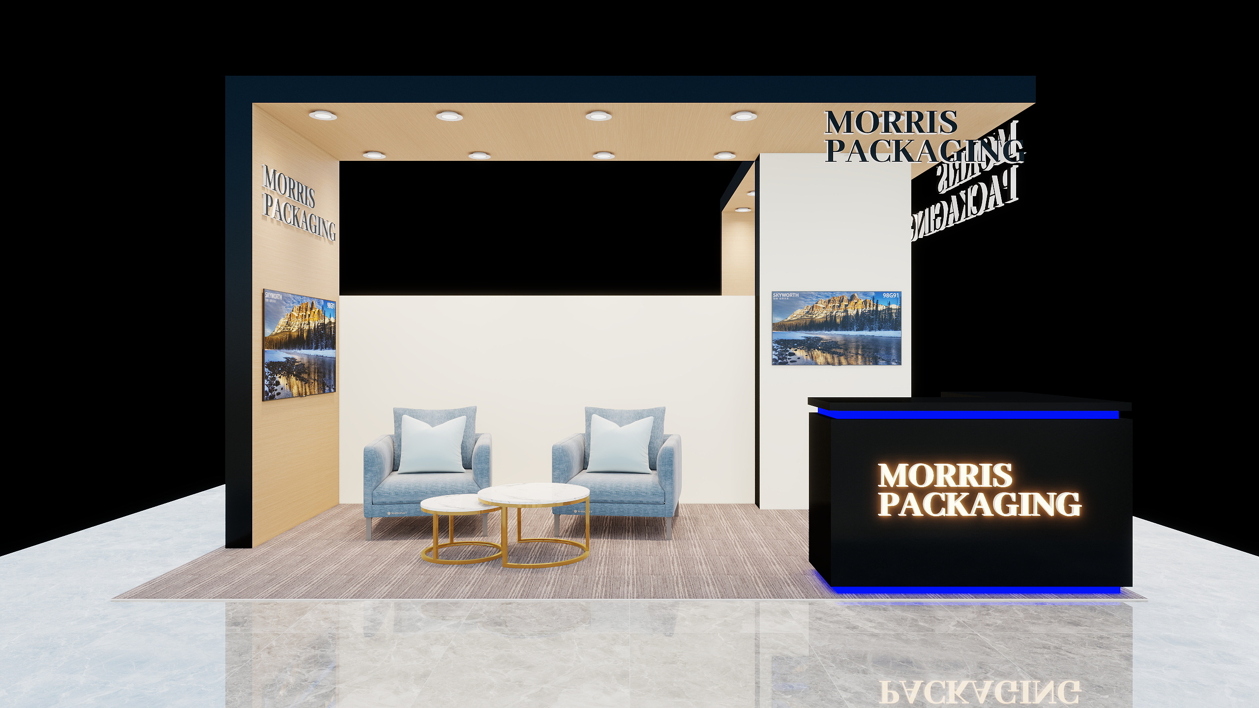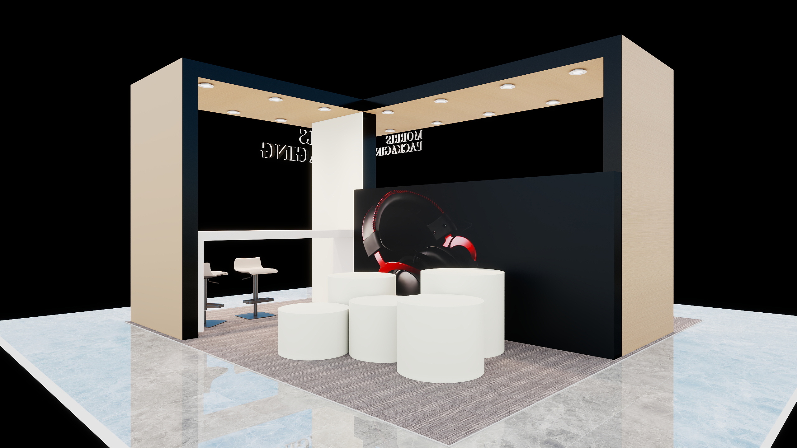 The booth combines natural textures and clean geometry to convey a professional and approachable image. The illuminated counter serves as a focal point, while the open frame increases visual depth and brand presence.